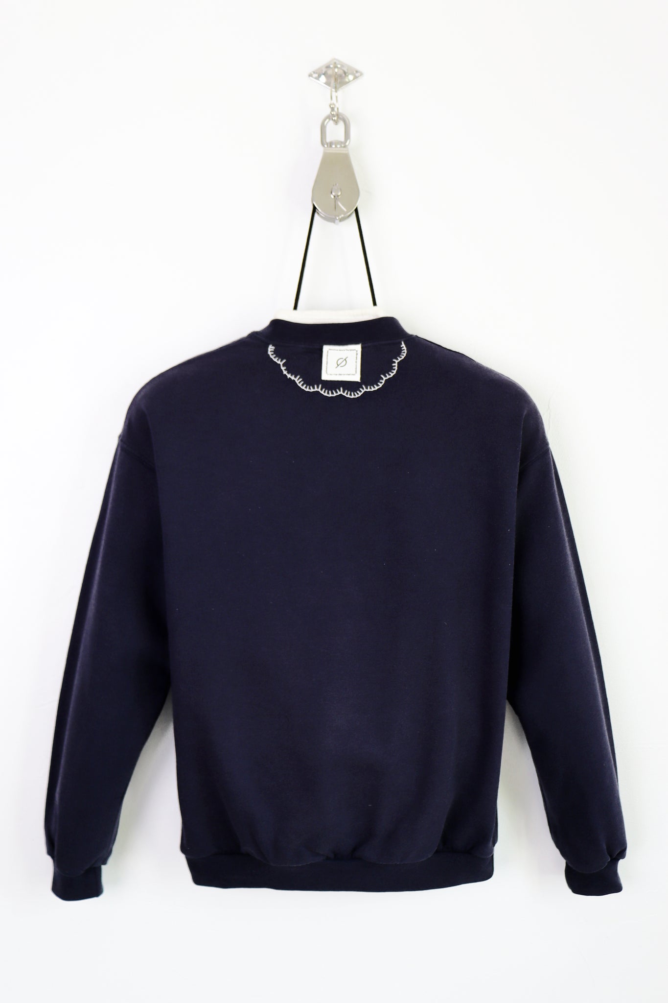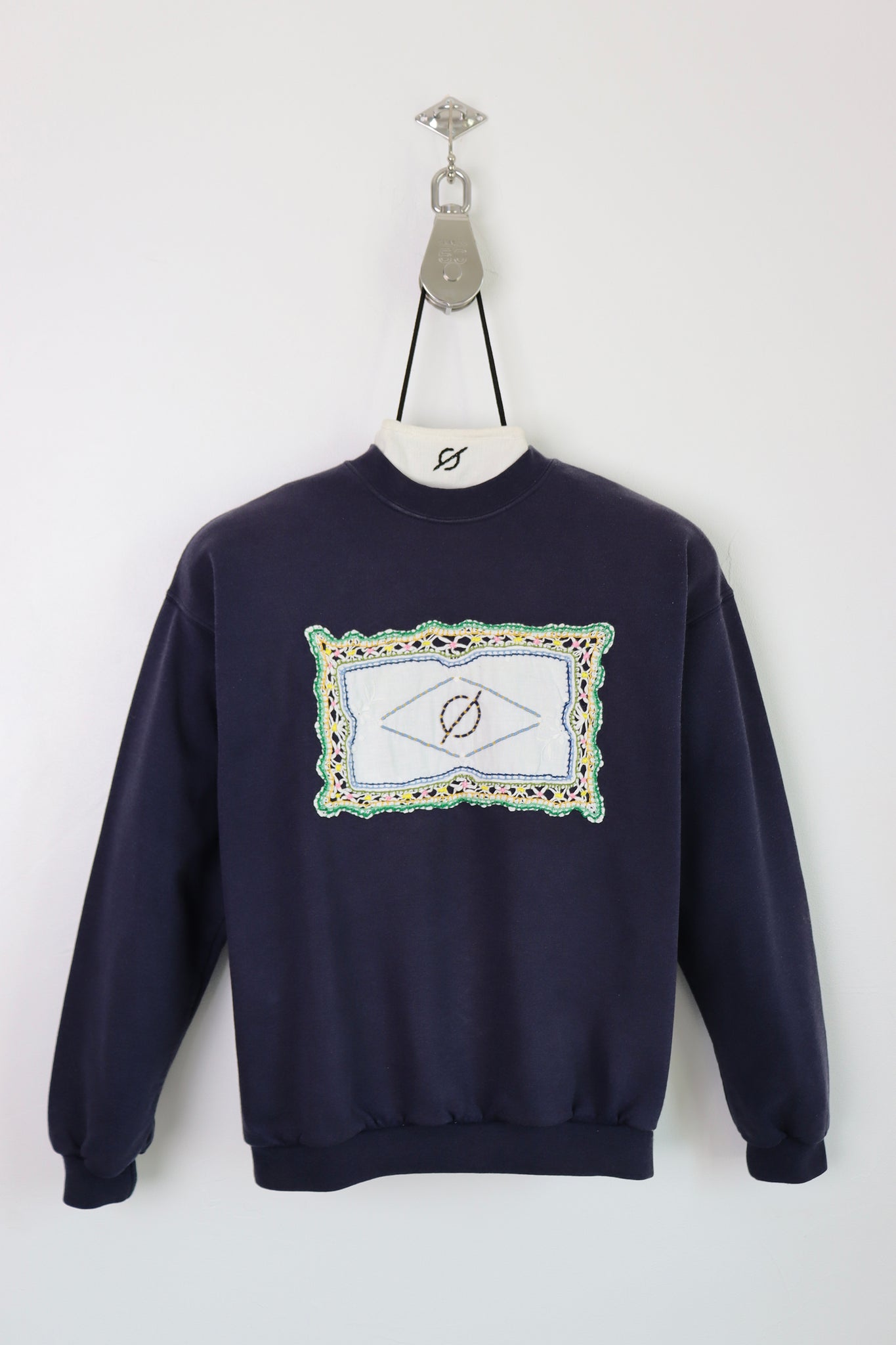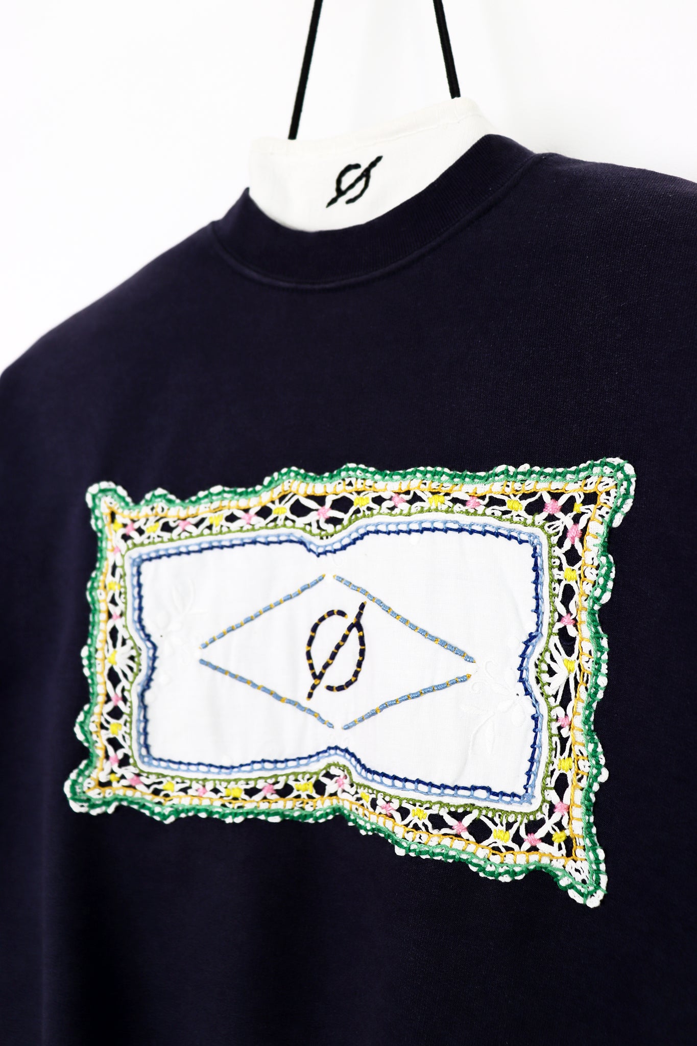 Sweat vintage navy, upcyclé avec application de napperons anciens