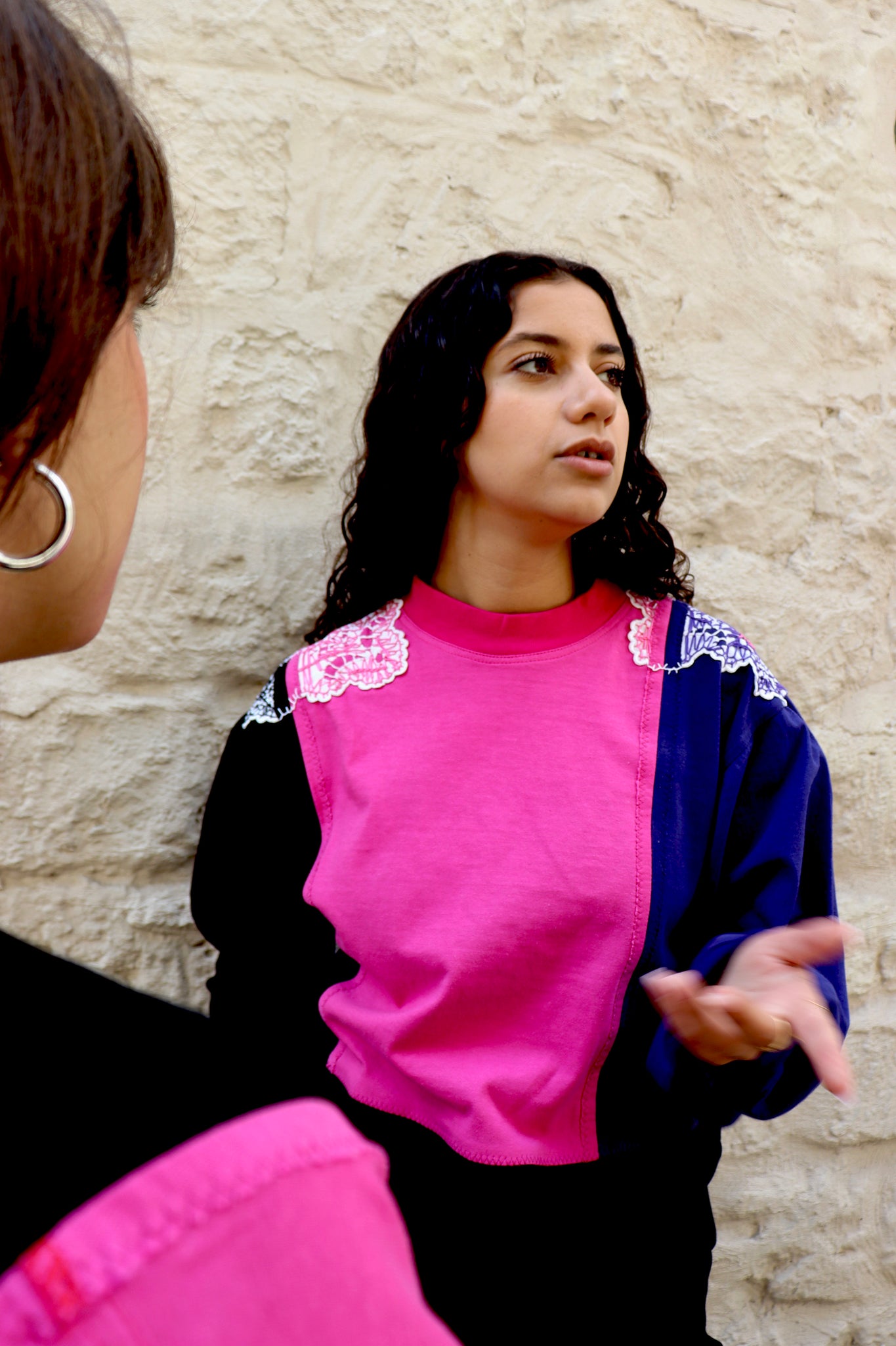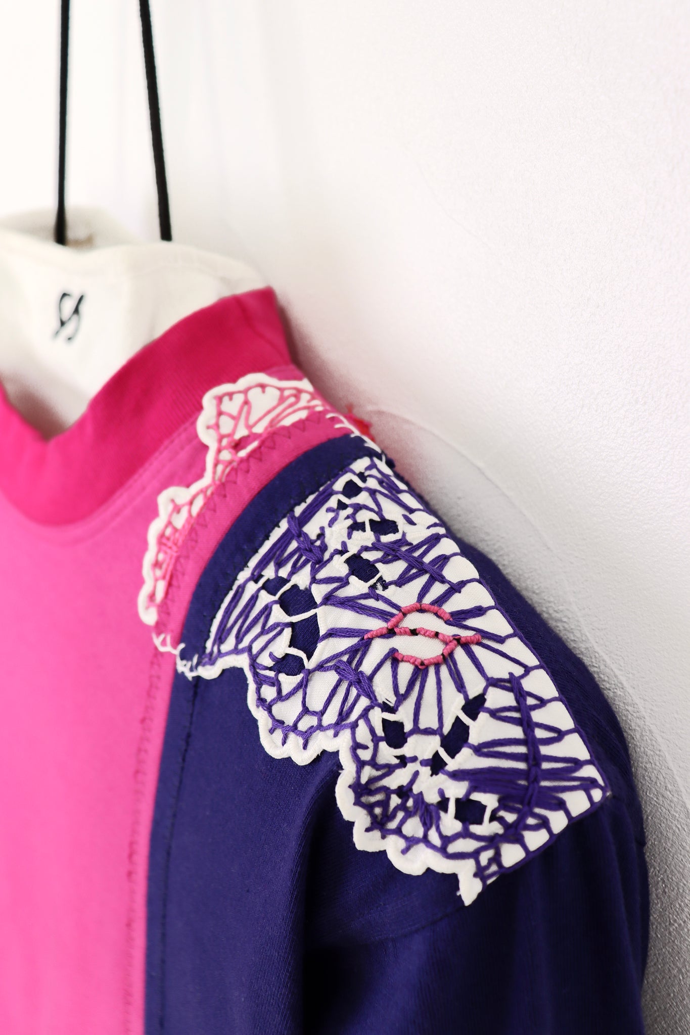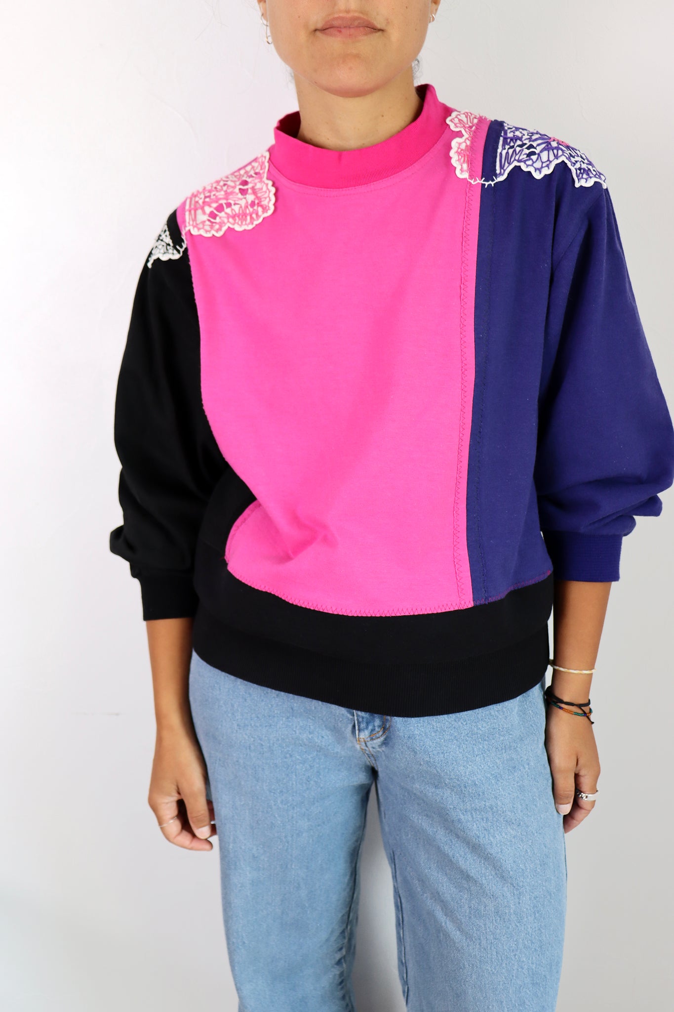 Assemblage de t-shirts vintages, color block noir/rose/violet avec application de napperons anciens